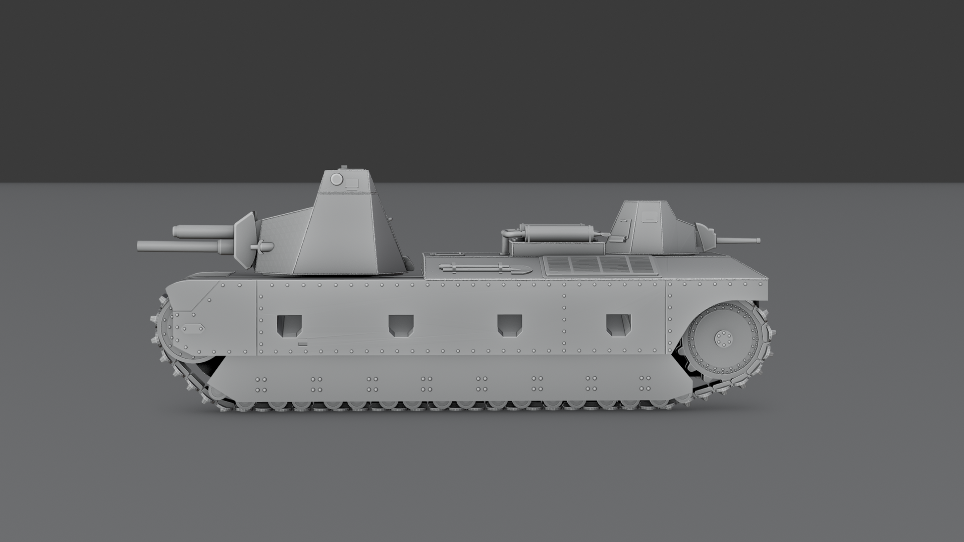 A 3D printed scale model kit of a heavy french tank prototype. The FCM F4 Variant D was a French heavy tank project developed in the late 1930s by Forges et Chantiers de la Méditerranée (FCM) as part of France’s effort to create a “char de rupture,” or breakthrough tank, capable of smashing through fortified enemy lines. Conceived in response to a 1936 army requirement for a heavily armored and powerfully armed vehicle, the F4 series was intended to combine a 75 mm main gun with a secondary 47 mm weapon and several machine guns. Variant D, proposed around August 1937, differed from earlier iterations by moving the 47 mm gun from a fixed hull position to a small rear turret, improving firing flexibility and giving the tank a more balanced, turret-based design. The vehicle was expected to weigh over 55 tonnes, with a crew of four and dual engines to achieve a modest top speed of about 30 km/h. Although it remained on paper, the FCM F4 represented a crucial stage in France’s exploration of heavy tank concepts, bridging the gap between interwar medium tanks and the later, massive FCM F1 super-heavy design. The project was ultimately abandoned as military priorities shifted and the French Army sought even larger, more heavily armored vehicles. Nonetheless, Variant D reflects the ambitious engineering thinking of pre-war France and the nation’s early attempts to balance firepower, protection, and mobility in a single breakthrough tank.